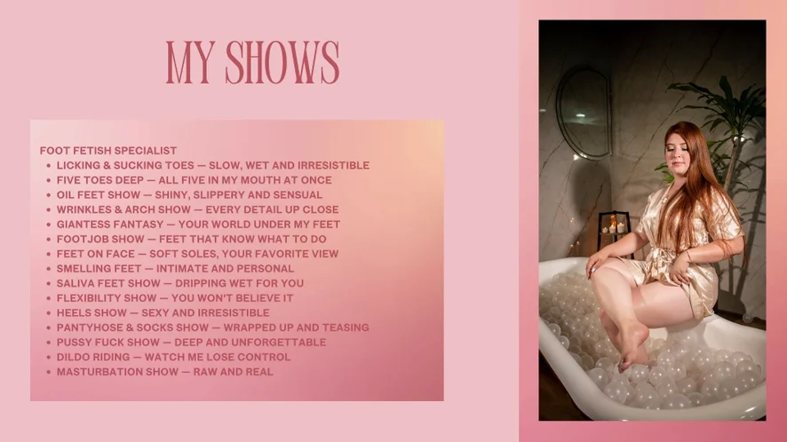 Doggy Style, Ahegao, Spanking, Cowgirl, Twerk, Camel Toe, Topless, Oil Show, Foot Fetish, Fingering, Masturbation, Blowjob, Handjob, Erotic Dance, Dildo or Vibrator, Nylon, Footjob, Deepthroat, Orgasm, Cock Rating, Sex Toys, Striptease, Hardcore, Upskirt